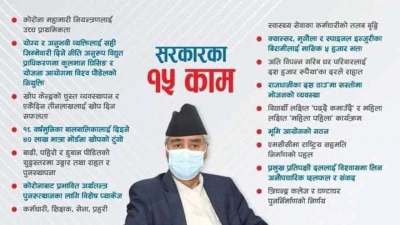 शेर बहादुर देउवा नेतृत्वको सरकार गठन भएको दुई महिना वितिसक्दा पनि काम प्रभावकारी नभएको भनी आलोचना शुरु भएपछि प्रधानमन्त्रीको निजी सचिवालयले प्रगतिका १५ बुँदे सूची सार्वजनिक गरेको छ ।