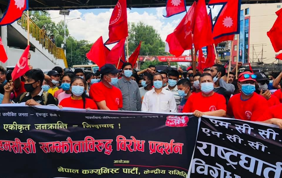नेत्रविक्रम चन्द ‘विप्लव’ नेतृत्वको दल नेकपाले अमेरिकी परियोजना एमसीसीको विरोधमा काठमाडौंको सडकमा विरोध प्रदर्शन गरेको छ । विप्लव भूमिगत अवस्थाबाट सार्वजनिक भएपछि पहिलो पटक सडकमा आयोजित विरोध कार्यक्रममा निस्किएका हुन् ।
